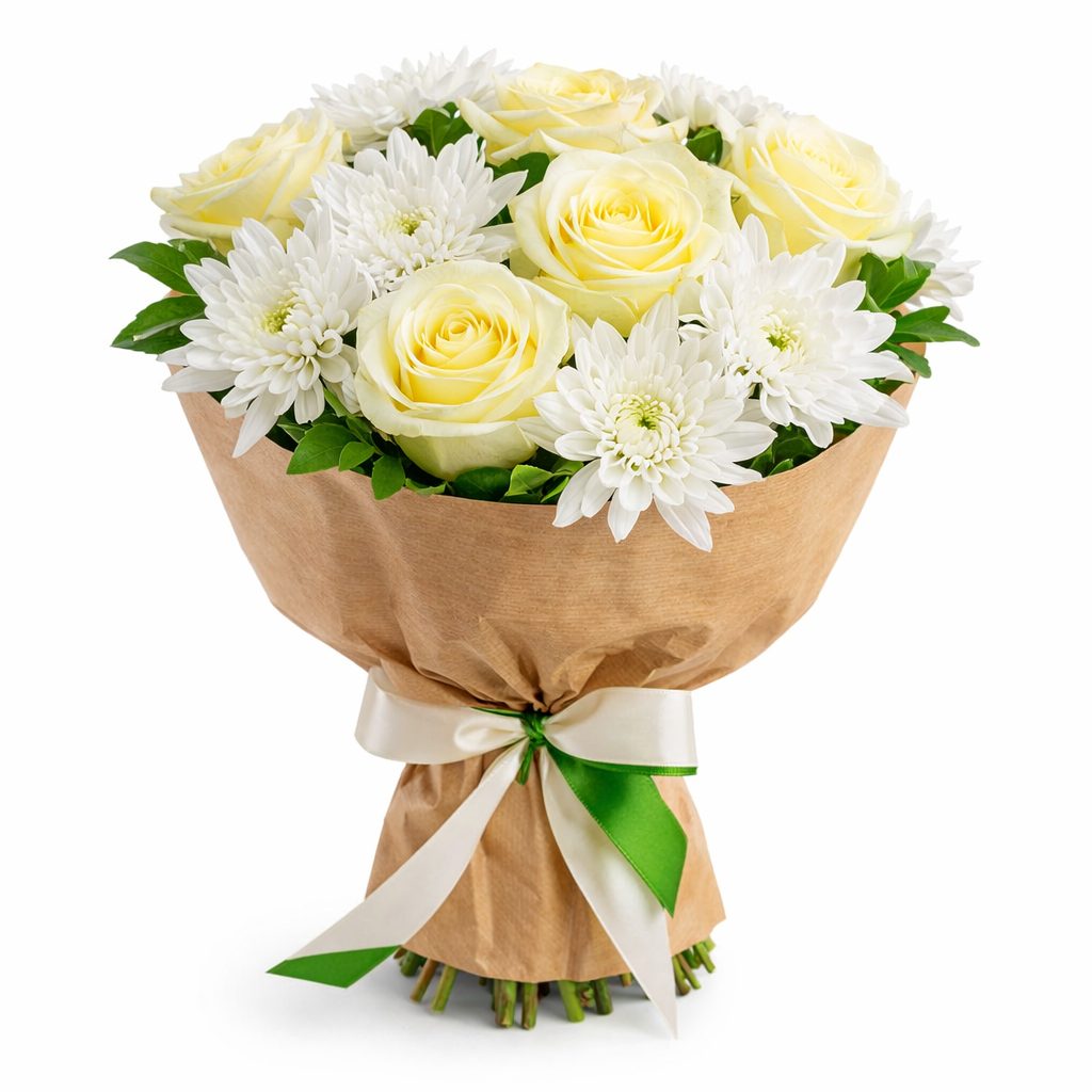 Белые розы и кустовые хризантемы создают нежный и воздушный ансамбль. Упакован в крафт-бумагу, перевязанную атласной лентой. Альтернативные варианты упаковки: матовая плёнка или декоративная сетка. Прекрасный подарок для любимой на годовщину или свадьбу.
