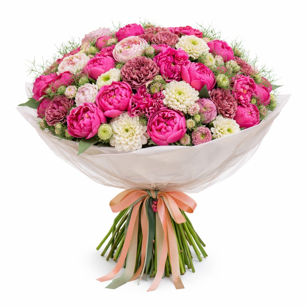 Роскошное сочетание розовых пионов, нежных розовых гвоздик, сиреневых кустовых хризантем и белых георгинов создаёт неповторимую композицию. Букет перевязан атласной лентой и обёрнут в матовую плёнку, что придаёт ему изысканный вид. Альтернативные варианты упаковки: крафт-бумага или декоративная сетка. Прекрасный выбор для подарка на день рождения для любимой.