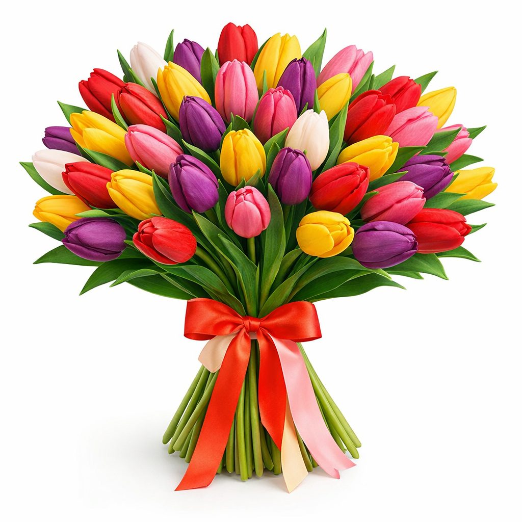 Яркие тюльпаны в миксе белого, жёлтого, оранжевого, красного, фиолетового и розового оттенков создают атмосферу весеннего праздника. Букет перевязан лентами разных цветов, добавляя нотку игривости. Возможны альтернативы упаковки с матовой плёнкой или крафт-бумагой. Прекрасный подарок для любимой на 8 марта или день рождения.