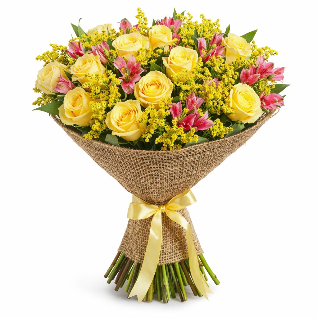 Яркие жёлтые розы в сочетании с розовыми альстромериями и солнечным солидаго создают атмосферу радости и тепла. Букет перевязан жёлтой лентой и обёрнут в матовую плёнку. Возможны альтернативы оформления: атласная лента или крафт-бумага. Прекрасный выбор для подарка на день рождения для любимой.