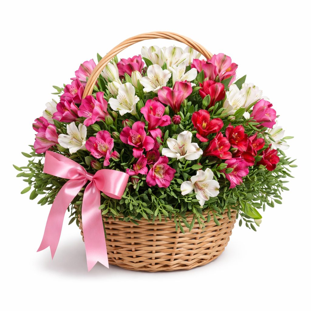 Яркие альстромерии в белых, розовых и бордовых оттенках создают неповторимую атмосферу праздника, дополненные свежей фисташкой. Цветы оформлены в плетёной корзине с оазисом, что обеспечивает их свежесть и долговечность. Альтернативно можно выбрать корзину из лозы или с тканевой отделкой. Прекрасный подарок для любимой на годовщину или для мамы на День матери.