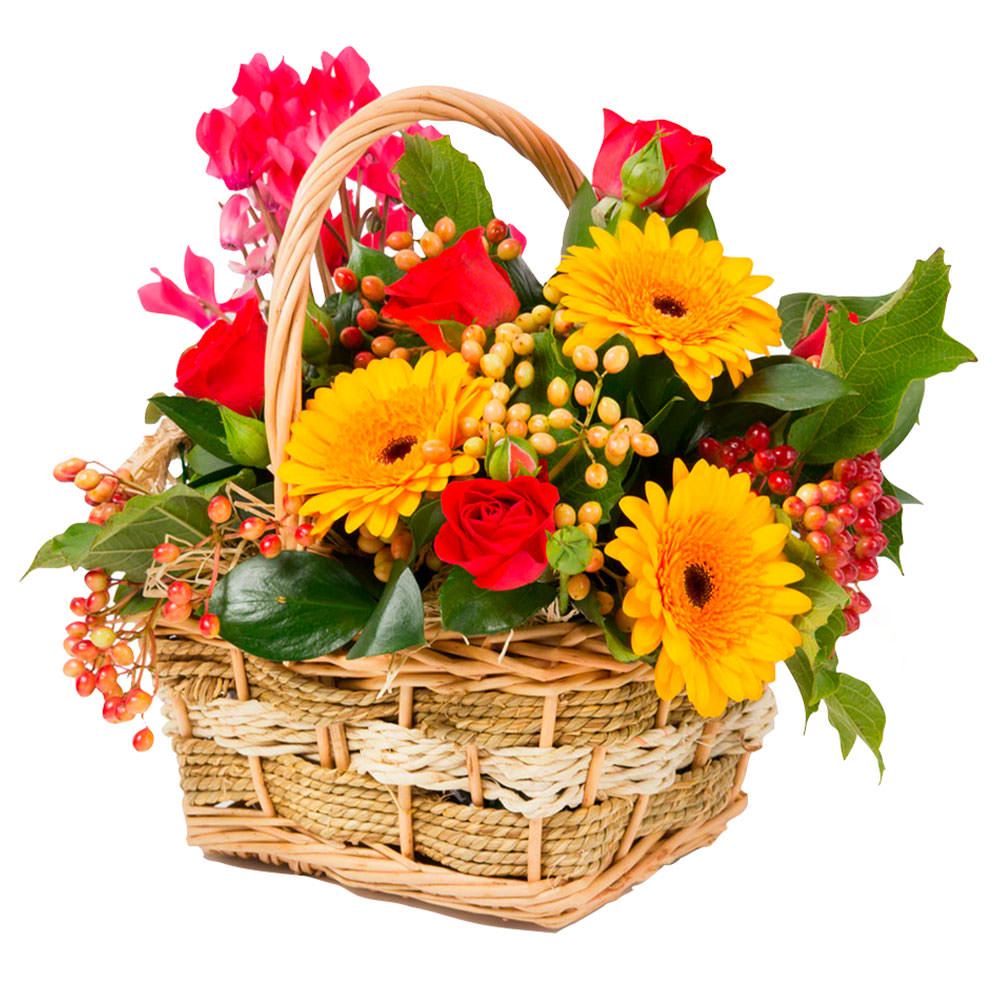 Яркие желтые герберы и красные розы создают гармоничную композицию с гиперикумом и зеленью. Цветы аккуратно размещены в плетёной корзине, что придаёт им естественный и уютный вид. Возможны варианты оформления в корзине из лозы или с тканевой отделкой. Прекрасный подарок для мамы на день рождения или юбилей.