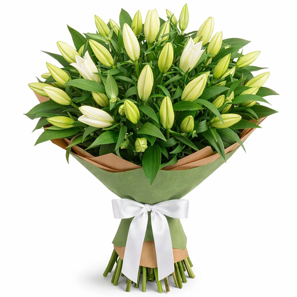 Изящные лилии в этом букете создают атмосферу утончённости и свежести. Упакован в крафт-бумагу и перевязан атласной лентой, он выглядит стильно и элегантно. Альтернативные варианты оформления включают матовую плёнку или декоративную сетку. Подойдёт для подарка на годовщину или для любимой.