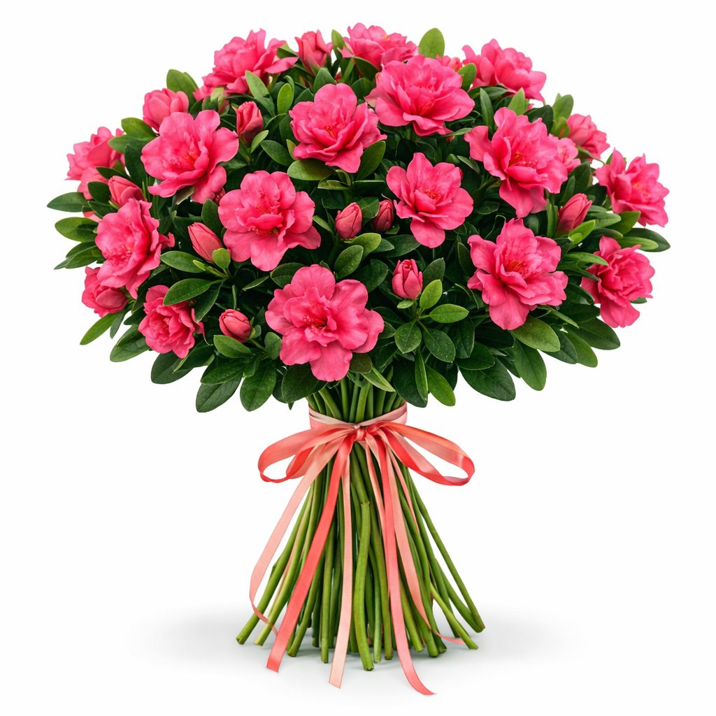 Розовые азалии создают нежное и романтичное настроение. Розовая атласная лента, подчеркивает изысканность композиции. Возможна упаковка в крафт-бумагу или декоративную сетку. Прекрасный выбор для любимой на День матери.