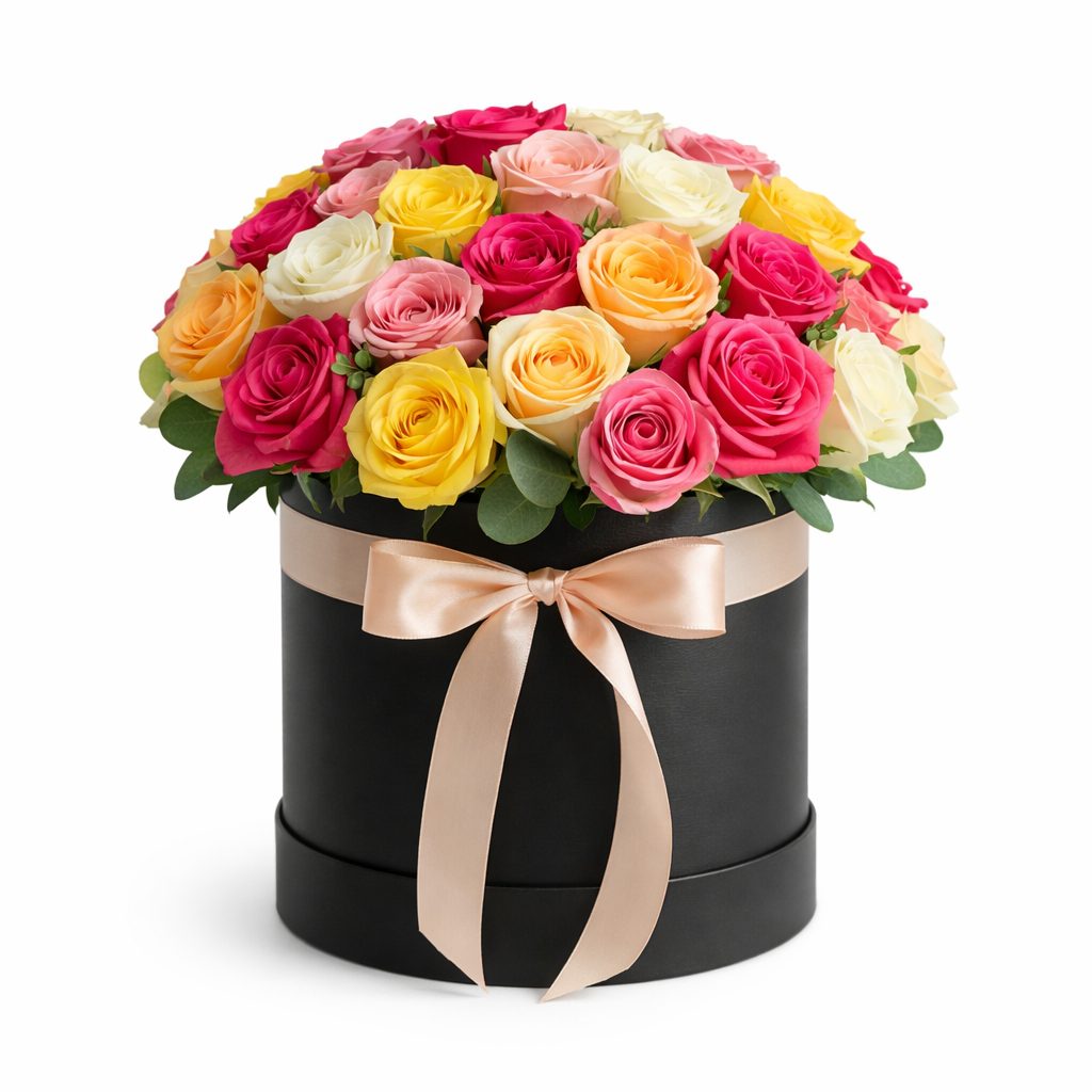 Яркие розы в кремовых, жёлтых и розовых тонах гармонично сочетаются с нежной розовой эустомой, создавая атмосферу летнего праздника. Композиция оформлена в элегантной шляпной коробке нежно-фиолетового цвета, перевязанной атласной лентой. Возможны варианты оформления в бархатной или дизайнерской коробке. Прекрасный подарок для любимой на день рождения или годовщину.