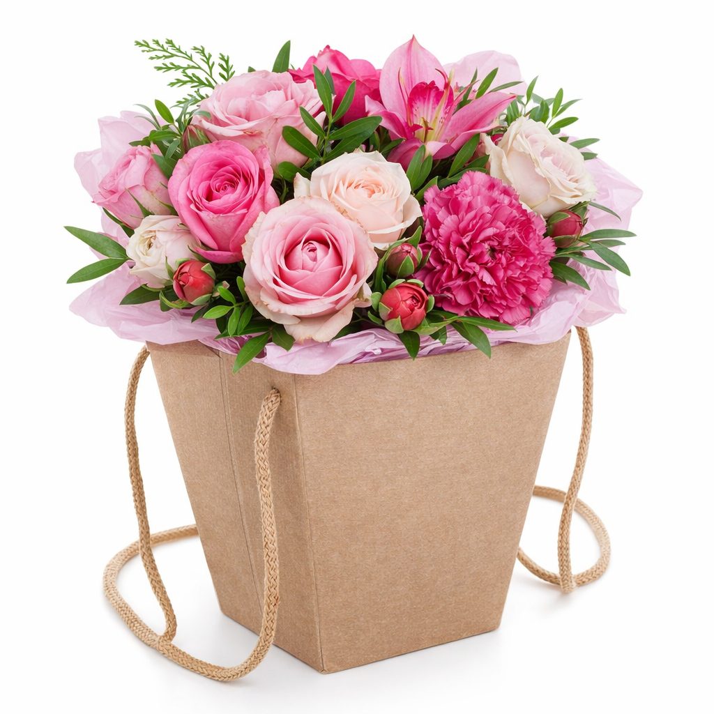 Эта изысканная цветочная композиция сочетает в себе розовые розы, пион, альстромерию, орхидею и гвоздику, дополненные свежей туей и фисташкой. Композиция оформлена в стильной квадратной коробке из крафт-бумаги, создавая элегантный и современный вид. В качестве альтернативы можно выбрать бархатную или атласную коробку. Идеально подойдёт для подарка на годовщину или для любимой.