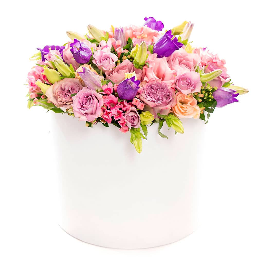 Эта изысканная композиция сочетает в себе бавардию, сиреневые и розовые одноголовые розы, персиковую эустому и кустовые розы. Цветы оформлены в элегантной белой шляпной коробке. Возможны альтернативы оформления: бархатная коробка или коробка с принтом. Прекрасный подарок для любимой на годовщину или день рождения.