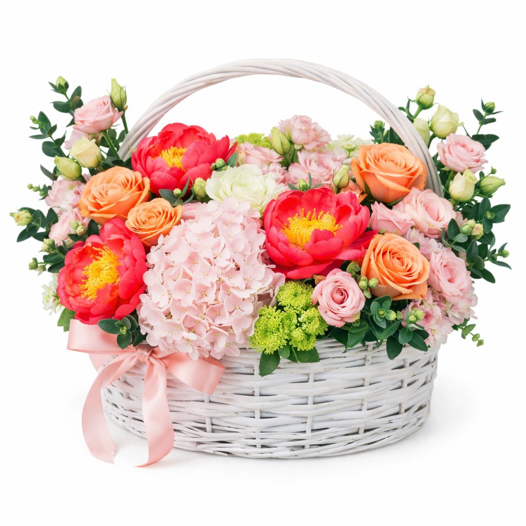 Розовая гортензия, коралловые пионы и персиковые розы создают яркий акцент в этой композиции. Элегантная розовая эустома и белая мини-маргаритка добавляют нежности, а вибурнум и эвкалипт завершают образ. Корзина выполнена из белого плетёного материала, что придаёт ей лёгкость и изящество. Возможны альтернативы оформления: корзина из лозы или с тканевой отделкой. Прекрасный подарок на годовщину для любимой.