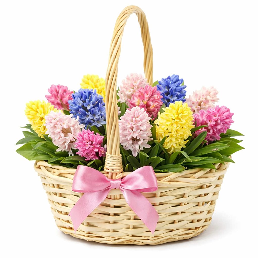 Яркие гиацинты в розовых, жёлтых, голубых и белых тонах, дополненные эвкалиптом, создают атмосферу весеннего праздника. Цветы аккуратно размещены в плетёной корзине с оазисом, что сохраняет их свежесть. Возможны варианты оформления в корзине из лозы или ротанга. Прекрасный подарок для любимой на 8 марта или день рождения.