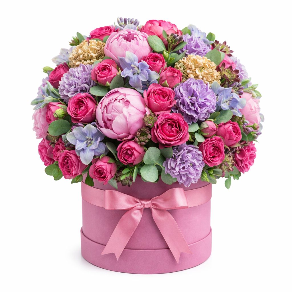 Пышная композиция из розовых пионов, сиреневых и капучино гвоздик, розовых кустовых роз и фрезий создаёт атмосферу нежности и изысканности. Цветы аккуратно размещены в стильной розовой шляпной коробке, подчёркивающей их красоту. Возможны варианты оформления в бархатной или атласной коробке. Прекрасный подарок для любимой на день рождения или годовщину.