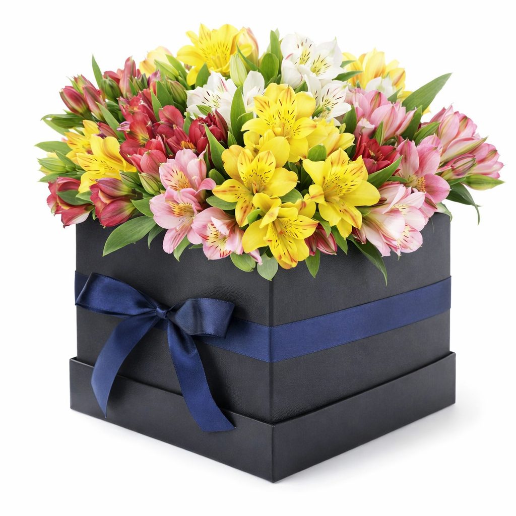 Яркие альстромерии в желтых, розовых и красных тонах создают атмосферу весеннего праздника. Композиция оформлена в элегантной черной квадратной коробке, подчеркивающей насыщенность цветов. Возможны варианты оформления в бархатной или дизайнерской коробке. Прекрасный подарок для любимой на 8 марта или на день рождения.