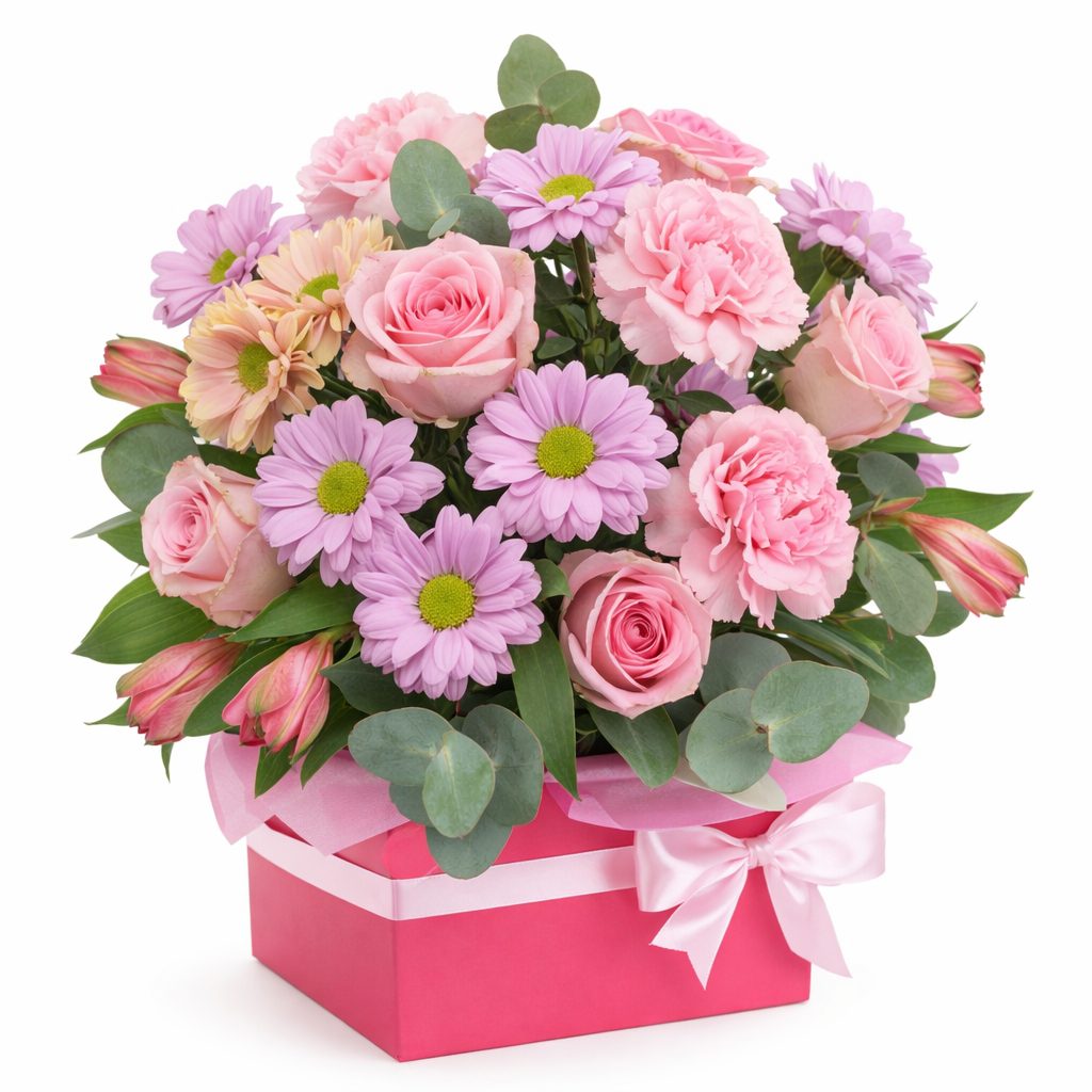 Розовые розы, сиреневые и кремовые хризантемы, розовые альстромерии и гвоздики, дополненные эвкалиптом, создают нежную и романтичную композицию. Цветы оформлены в яркую квадратную коробку, перевязанную атласной лентой. Возможны варианты с бархатной или дизайнерской коробкой. Прекрасный подарок для любимой на 8 марта или на день рождения.
