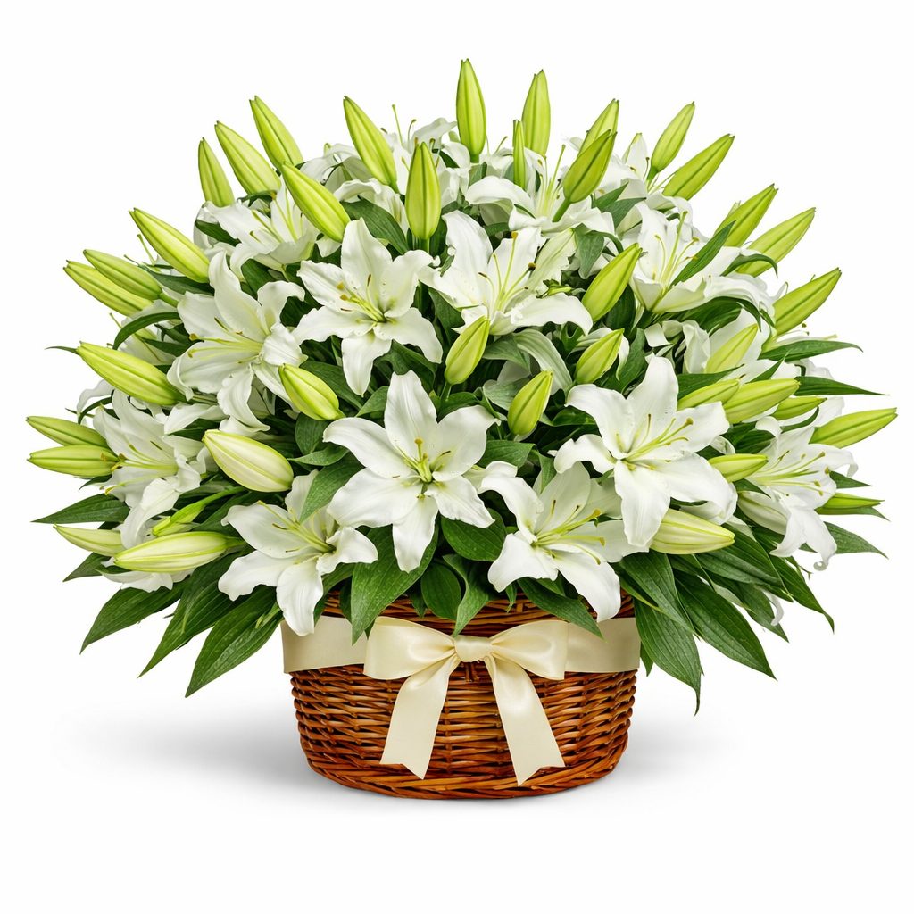 Белоснежные лилии в плетёной корзине создают атмосферу нежности и утончённости. Корзина из лозы подчёркивает естественную красоту цветов. Возможны другие варианты оформления: корзина из ротанга или с тканевой отделкой. Прекрасный подарок для мамы на День матери или для любимой на годовщину.