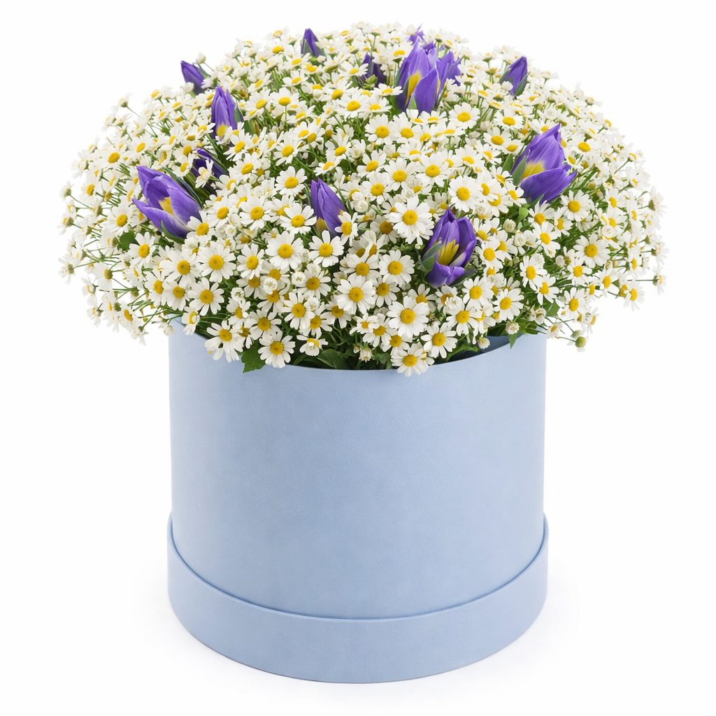 Ромашки и ирисы создают нежную и яркую композицию, наполненную летним настроением. Цветы аккуратно размещены в голубой шляпной коробке, которая подчёркивает их свежесть и изящество. Возможны альтернативы оформления: бархатная коробка или коробка с принтом. Прекрасный подарок для любимой на день рождения или годовщину.