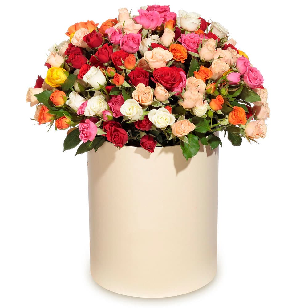 Яркая композиция из кустовых роз в кремовых, оранжевых, красных и розовых оттенках создаёт атмосферу праздника. Цветы оформлены в элегантной шляпной коробке, подчёркивающей их изысканность. Возможна альтернатива в бархатной или атласной коробке. Прекрасный подарок для любимой на день рождения или годовщину.