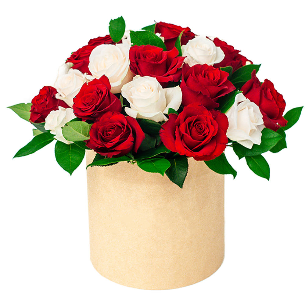 Эта изысканная композиция из белых и красных роз, дополненная зеленью, создает атмосферу романтики и утонченности. Цветы аккуратно размещены в элегантной шляпной коробке кремового цвета. Возможны варианты оформления в бархатной или атласной коробке. Прекрасный подарок для любимой на годовщину или день рождения.